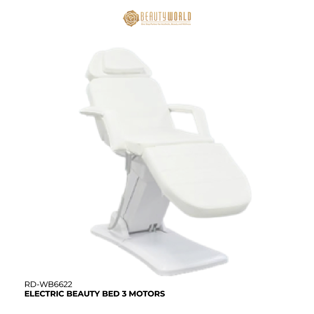 Electric Beauty Bed 3 Motors adalah tempat tidur sekaligus kursi kecantikan elektrik dengan 3 motor untuk kontrol penuh atas ketinggian, sandaran punggung, dan sandaran kaki.