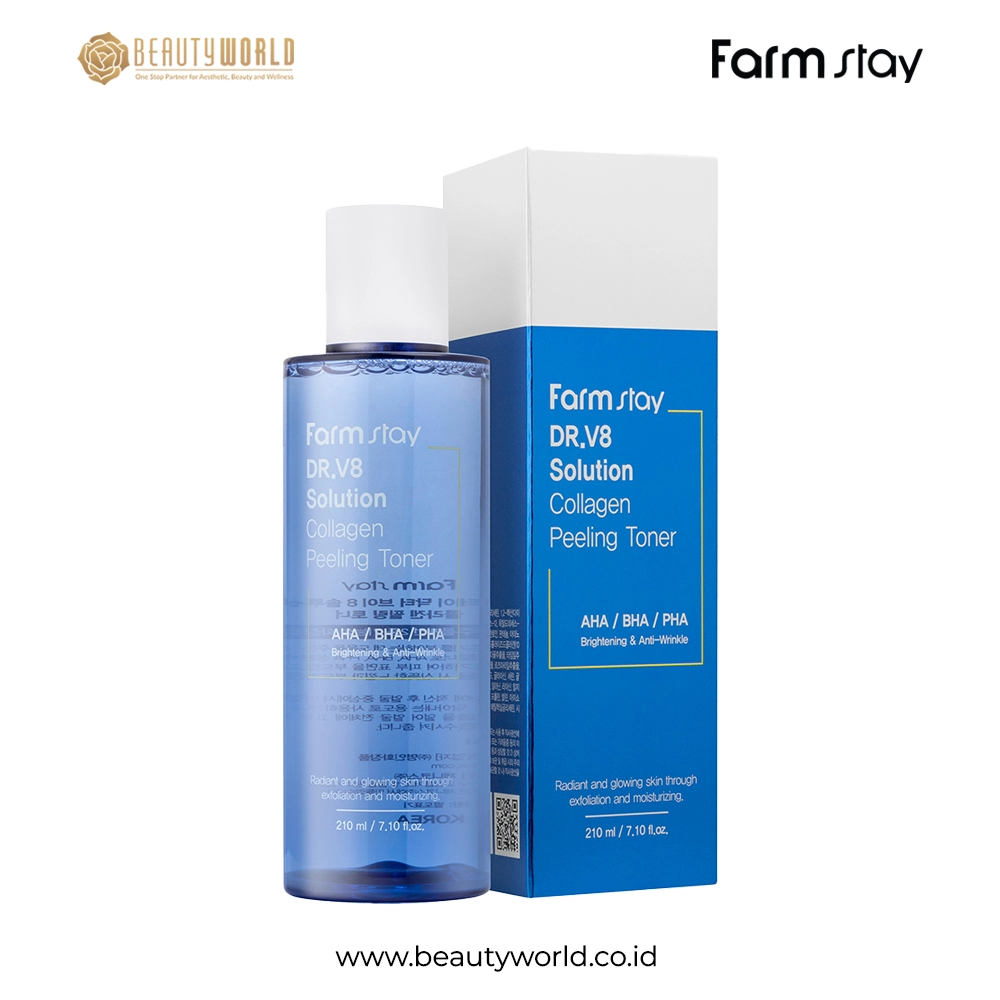 Farmstay DR V8 Solution Collagen Peeling Toner adalah toner eksfoliasi berteknologi ganda yang membersihkan permukaan kulit sekaligus memberi nutrisi kolagen.