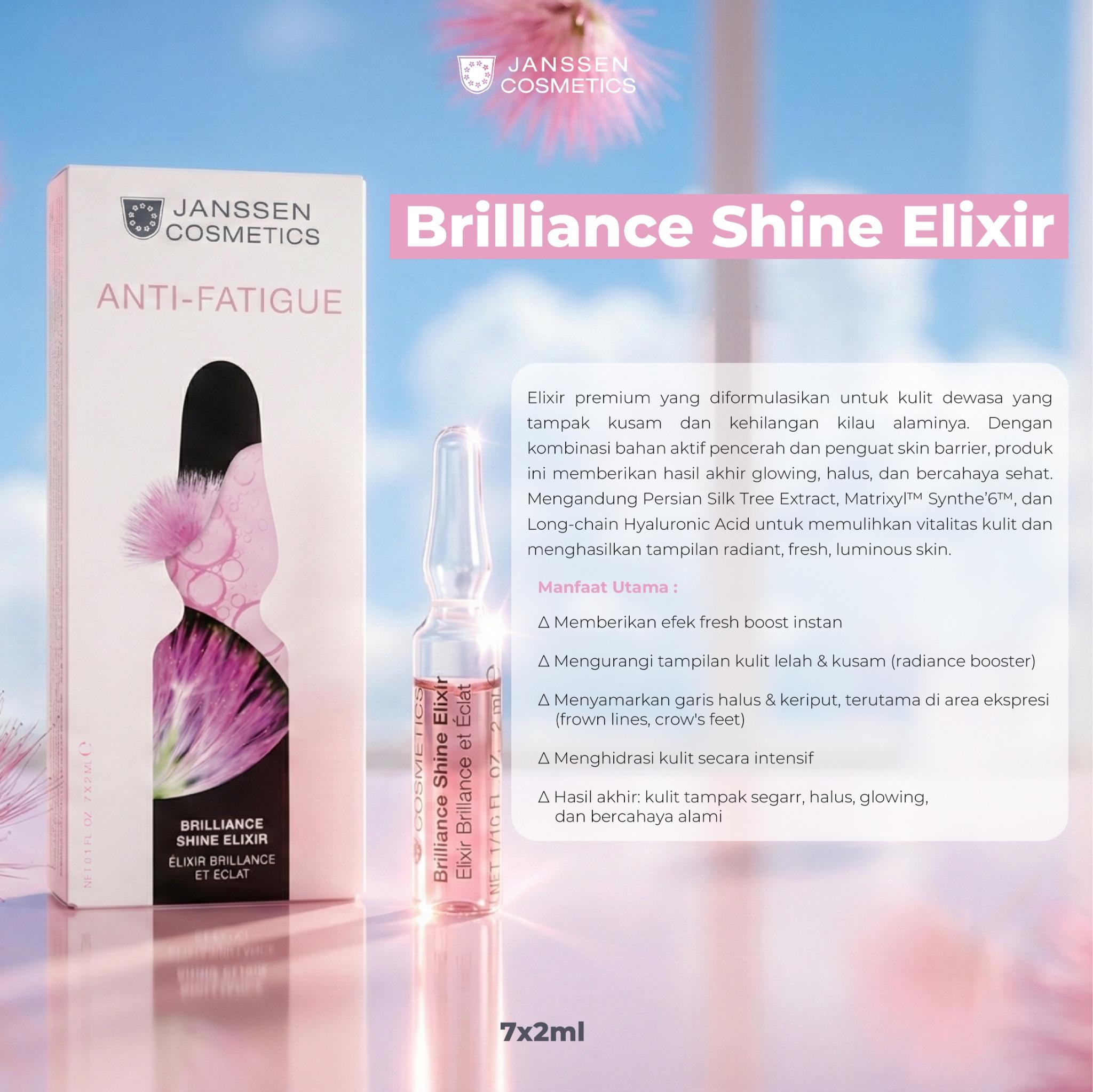 Paket 7 ampul Brilliance Shine Elixir 2ml untuk kulit yang tampak kusam dan kelelahan. Dengan formulasi khusus untuk memberikan efek glowing, hidrasi intensif, dan perlindungan anti-aging. Dengan kombinasi bahan aktif pencerah dan penguat skin barrier, produk ini memberikan hasil akhir glowing, halus, dan bercahaya sehat. Mengandung Persian Silk Tree Extract, Matrixyl™ Synthe’6™, dan Long-chain Hyaluronic Acid untuk memulihkan vitalitas kulit dan menghasilkan tampilan radiant, fresh, luminous skin.